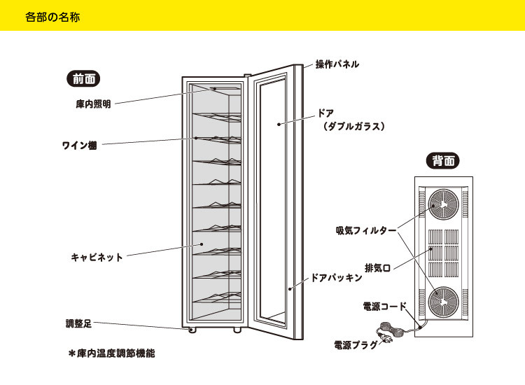 冷却能力は使用環境温度(10~30°C)の範囲内でご使用の場合、周囲温度より最大約-15°Cです。 設定温度と実際の庫内温度は周囲温度により異なります。