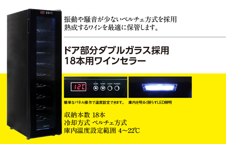 シンプルかつすっきりしたデザイン。庫内にはレギュラーボトル(750ml)で18本収納可能。外気温の変化に応じて、冷却を行い、最適な温度環境でワインを熟成させます※1