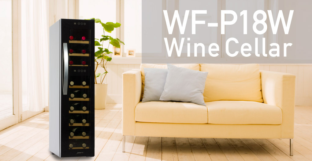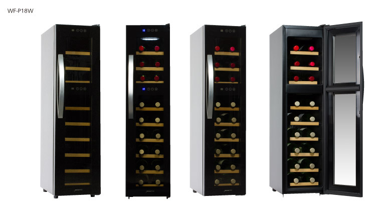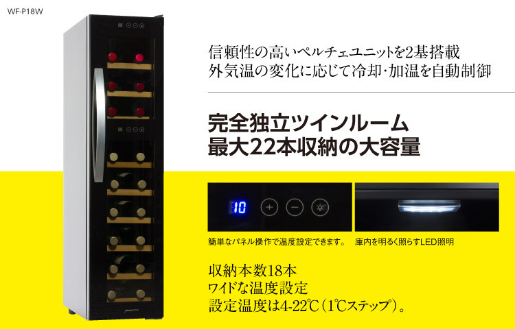WF-P18W』は、日本メーカー製の高信頼性ペルチェ素子を使用した冷却ユニットを2基搭載した18本用のワインセラーで、最大22本の収納が可能になっています。※ボルドータイプの場合。