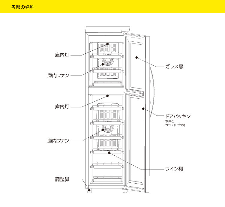 ● ガラス扉と本体の間に障害物がある、ワインボトルの位置が正常でない、