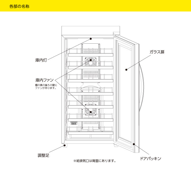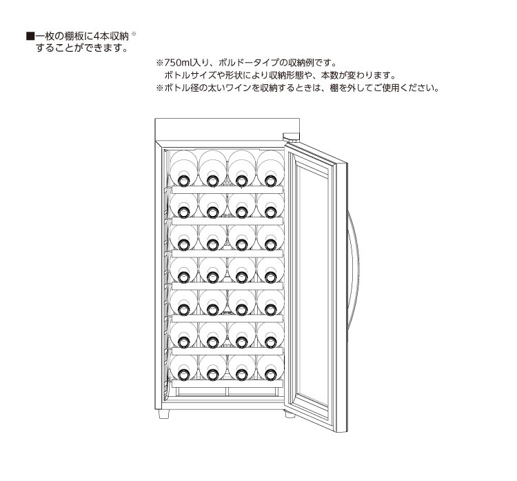 外観面でも4mm厚のペアガラスドアにステンレス製ハンドルを施し、前面木製ワイン棚を採用するなど上位機種と同様の仕様となっています。